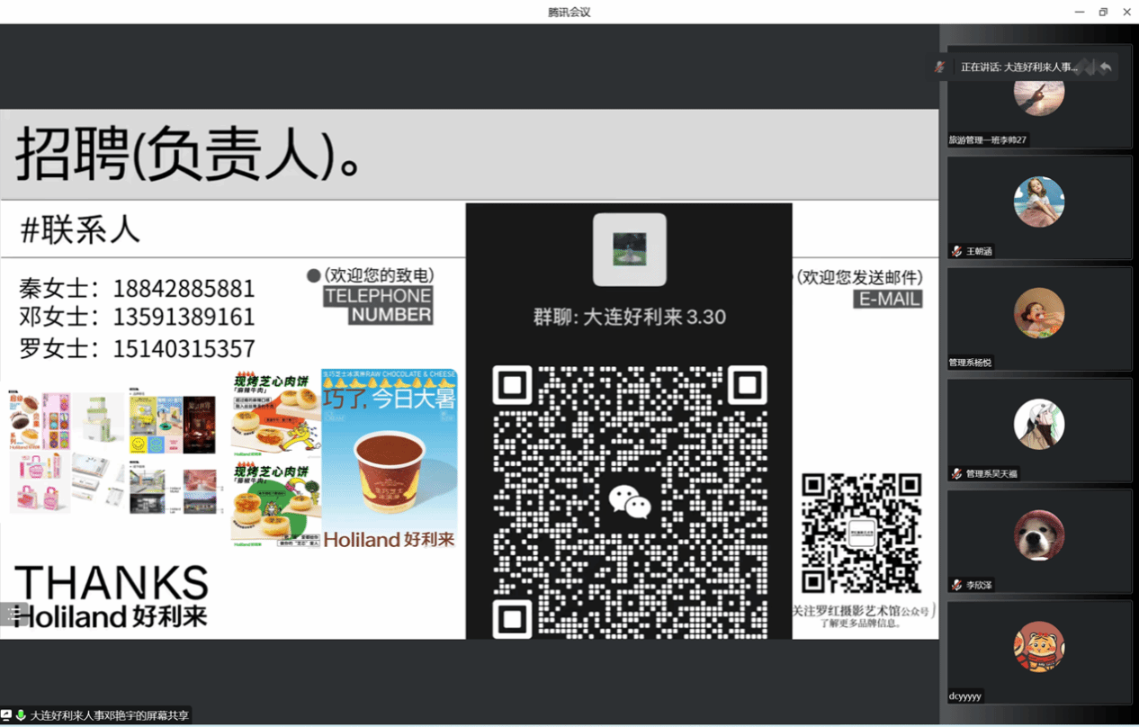 为加快推进2023届毕业生的就业指导工作,为毕业生提供更好的就业指导服务,切实落实推进就业相关工作。管理系于3月30日下午18时携手大连好利来企业召开线上招聘宣讲会。系部就业指导教师、毕业班辅导员及2019级毕业生参加招聘会,会议由就业指导教师苏玉珍主持。