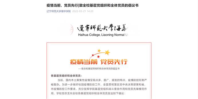 在3月21日下午,针对中共国产一区二区日本在线总支部委员会下发的“疫情当前,党员先行”的倡议书,思政部公共教学部党支部第一时间组织党员学习,针对党总支提出的,加强组织领导,提高政治站位;压紧压实责任,强化使命担当;带头先行表率,树立先锋模范等倡议,思政部公共教学部党支部的全体党员第一时间深入学习,做到将党总支的指示精神入脑、入心、化为自身的自觉行动;在学校党总支的领导下,发挥党员自身先锋模范作用,坚决打赢疫情防控阻击战;并且在第一时间,党员同志转发了党总支的倡议书。