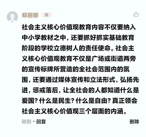 在“建设社会主义文化强国—核心价值观” 中建言:“社会主义核心价值观教育内容不仅要纳入中小学教材之中,还要抓好抓实基础教育阶段的学校立德树人的责任使命;社会主义核心价值观教育不仅是广场街道两旁的宣传标牌所营造的全社会范围内的氛围,还要通过宣传和立法形式,弘扬先进,惩戒落后,让全社会都知道什么是爱国?什么是民主?什么是自由?真正领会社会主义核心价值观三个层面的内涵。”