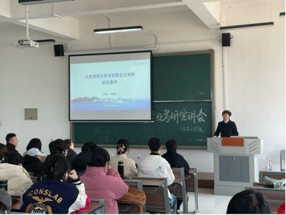 宣讲伊始,大连海洋大学马克思主义学院邱金英院长从校园环境、院系和专业设置、教风学风等方面出发,向全体师生介绍了大连海洋大学的基本情况;其次,从马克思主义学院创建历程、教育理念、科研情况、师资队伍、研究方向等方面进一步介绍了学院概况、学科简介及人才培养。最后,邱院长鼓励学生们,考研之路漫长而艰辛,但是要始终坚定信心,勇往直前,深入思考,早做规划。