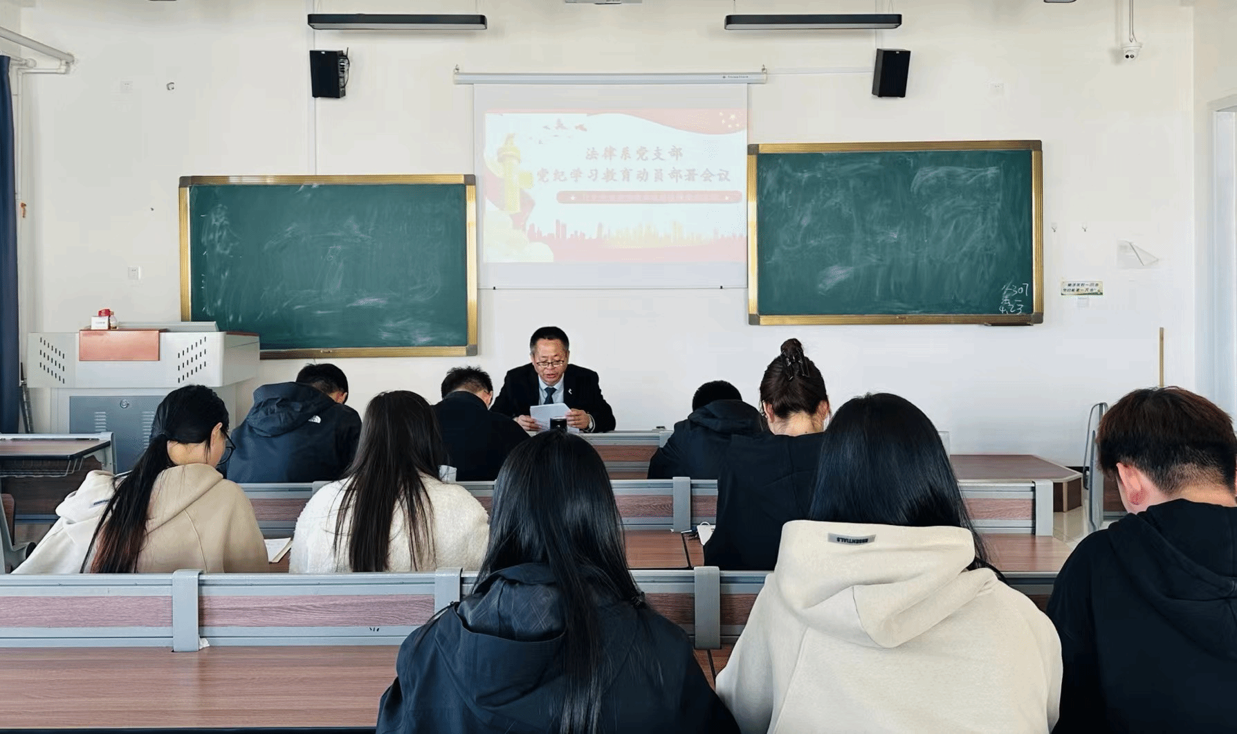 4月24日,法律系党支部在5——307教室召开党纪学习教育动员部署会议,法律系全体师生党员参加会议。学校党委委员、法律系党支部书记王树海作动员讲话,指出开展党纪学习教育,是当前和今后一段时期全系的一项重大政治任务,全系党员干部要统一思想认识,迅速行动起来。就开展党纪学习教育,他提出四点要求: